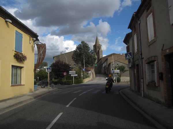 Hier rijden we door Saint Felix Lauragais, waar je de oorspronkelijke weg rechtsdoor ziet lopen naar de kerk toe.