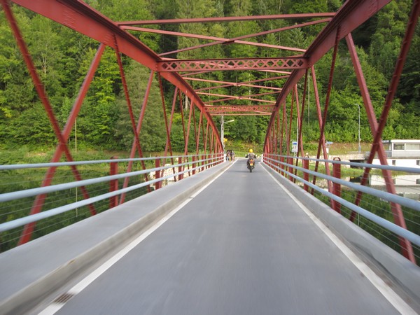 We steken de Doubs over via deze ijzeren brug. Aan de overkant een niet meer gebruikt douanekantoortje: we zitten in Zwitserland.