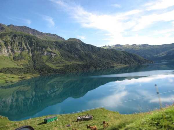 Dan rij je langs het Barrage de Roselend, een onwaarschijnlijk blauw stuwmeer, dat de bergen er omheen weerspiegelt.