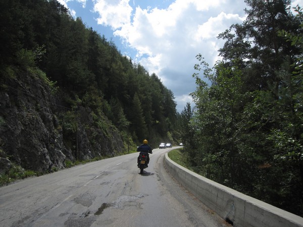 Een Duitse motorrijder achter ons geeft het goede voorbeeld en haalt alle auto's in één keer (tamelijk onverantwoord, dat wel) in. Ik zie hem met jaloezie de bochten tegemoet rijden zonder verkeer voor zich.