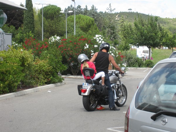 Even verderop zit een Harleyrijder, met dochtertje. We zien ze even later wegrijden. Ze is misschien niet op z'n allerveiligst aangekleed, maar zo'n ritje naar de McDonalds zal voor haar een herinnering worden die ze nooit meer vergeet.