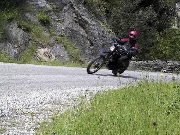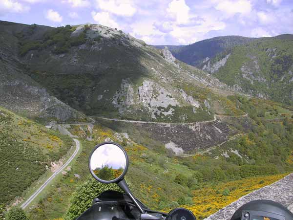Tenslotte, bij terugkomst, wist Roland nog een leuk plekje met uitkijktoren, dus we reden weer achter hem aan. Het begip "hobbelweggetje" heeft bij iedereen die achter hem aan hobbelde sindsdien een definitief andere en vooral diepere betekenis gekregen. Ik reed achter Roland, en achter mij zat die Guzzi. Ik sta er nog steeds verbaasd van dat die toch steeds weer in mijn spiegeltje zat: talloze keren was ik er van overtuigd dat hij na deze bult toch echt van de berg gecatapultiseerd had moeten zijn.