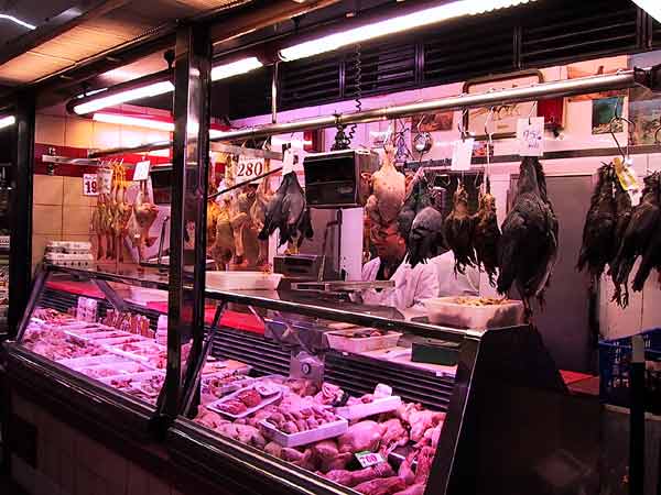 We dwalen even tussen het vlees, en kunnen nog net getuige zijn van aan hun snavel opghehangen houtsnippen (heb ik godverdegodver nog maar één keer in mijn leven in levende lijve in het wild gezien), en wat patrijzen, verschillende soorten duiven en fazanten die gewoon aan een touwtje om hun nek bungelen.