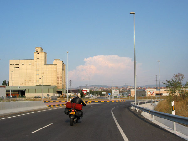 We moeten door Pamplona zien heen te komen in de hitte, liefst zonder al te veel stoplichten en dergelijke.
