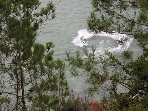 Op de terugweg komen we een waterscooter tegen die zijn kunsten vertoont: met enorme snelheid naar de kant, en dan vlak van tevoren een heel krap bochtje draaien (had ik al gezegd dat Basken stoer zijn?).