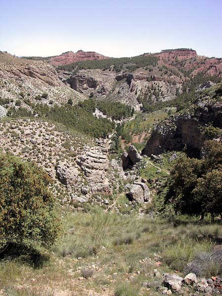 Eerst rijden we langs het Embalse de Canales, over een brede asfaltweg. Rechts aan de overkant gaat het enorm de hoogte in, en één van de meest absurde uitzichten is zo'n hoge berg, met op de top, waar je woestenij verwacht, een Osbornestier (een enorme zwart-metalen stier, vroeger voorzien van reclame voor Osborne, maar sinds wegreclame verboden is in Spanje is die reclame er afgehaald. De stieren moesten eigenlijk weg, maar daar waren alle Spanjaarden tegen, en terecht).