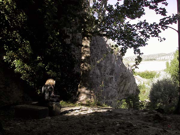 Het allermooiste hier was de Ermita de nostra Signora de los Angeles, een kapelletje in een grot. Binnen bloemen en schilderijtjes. Er stond een verhaal bij, dat op deze plek ooit een ruiter was aan komen galopperen, op de vlakte hierboven, en op deze plek naar beneden was gedonderd (de bovenkant van de kloof is hier zo'n twintig meter hoog). Hij was ongedeerd, en uit dankbaarheid heeft hij deze Ermita gebouwd. Daar kan ik me wel wat bij voorstellen...
