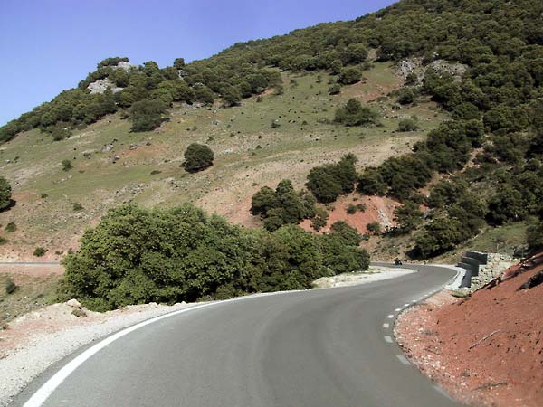 Het begint echt om lekker wakker te worden: heuvelachtig, heerlijke bochten, dan weer wit gestreepte rotsen, dan weer heuvels die met een kam bewerkt lijken te zijn om de lijnen van de daar aangelegde terrassen aan te brengen, dan weer donkere dreigende bergen, thijm en andere kruiden om te ruiken, en superasfalt.