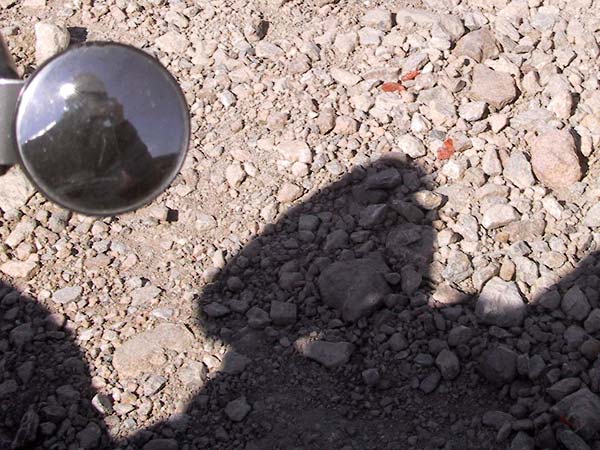 Tenslotte verandert de weg in eentje van losse stenen, en zien we beneden ons het lint van een geasfalteerd weggetje liggen. In een serie haarspelden dalen we af. Langzaam, omdat ik zo steil op losse stenen niet echt durf te vertrouwen op goed kunnen remmen ondanks de TKC's, maar ondanks dat zijn we in belachelijk korte tijd beneden, en zien we voor het eerst sinds 50 km weer asfalt. Dit was echt ongelofelijk.