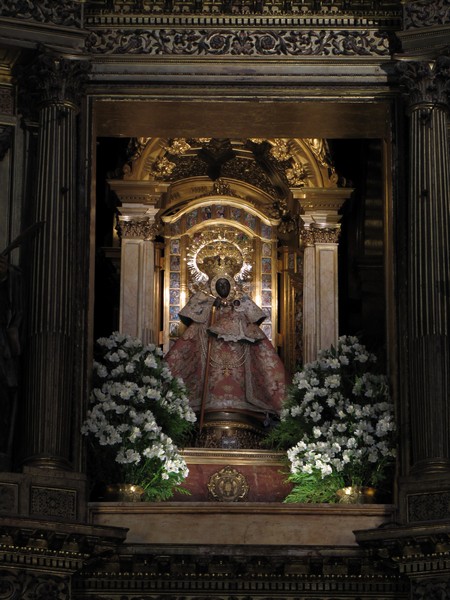 Hier zie je dat altaarstuk van dichtbij: beelden, schilderijen, allemaal gedrapeerd rond het centrale stuk, de zwarte madonna (het verlichte ding in het midden).