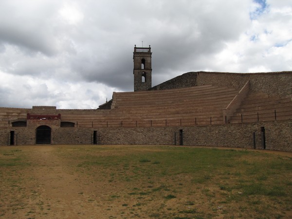 Je kunt van hier wel de arena zien liggen: de corrida is met gras begroeid.