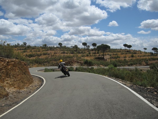 Dan rijden we het mooie weggetje uit Almonaster terug naar de N435, en volgen we de N435 een stuk naar het zuiden. Heerlijke bochten door bergen met eikenbos: een heel erg mooi motorgebied! (de foto's van dit stukje zijn mislukt doordat de camera nog stond ingesteld voor foto's in het donker).