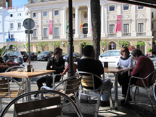 De Plaza de San Juan de Dios laat mooi zien hoe plezierig Cadiz is: de lichte gebouwen, niet te hoog, de palmen (je ziet net een stam), het terrasleven, de oude gebouwen ertussen.