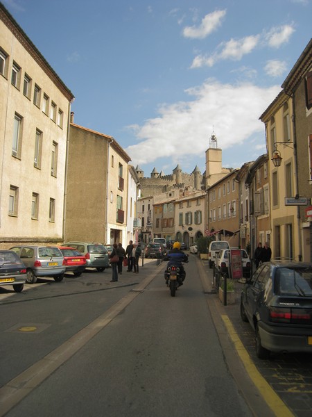 Op een winderig plekje tussen twee rotondes wissen we de hotels uit de route (er stonden drie punten in Carcassonne, geen wonder dat de Becker ons maar heen en weer stuurde), en dan worden we nog één keer door Carcassonne geleid (met een mooi gezicht op de ommuurde Cité met kasteel).