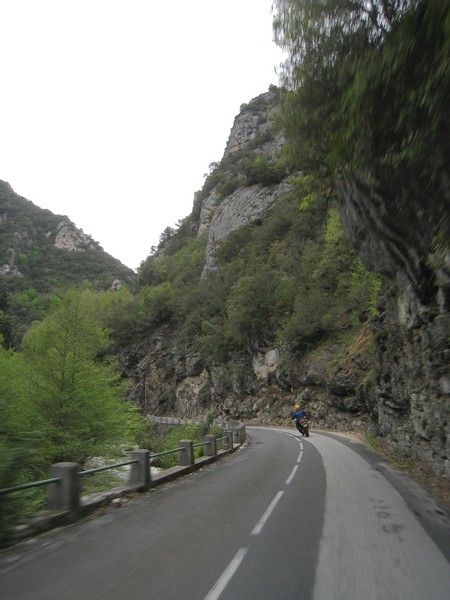 Er rijden veel motorrijders langs deze weg: we zien nog een Voxan die even onze parkeerplek opdraait om, samen met z'n medemotorrijders, te poseren voor een foto en dag te zwaaien.
