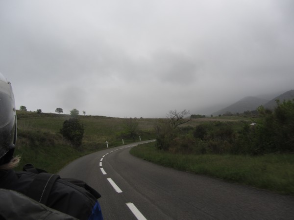 Het is droog maar erg mistig. We rijden naar het zuiden over de D907. Dat is, zoals je ziet, een droomweg, een motorrijdersweg.