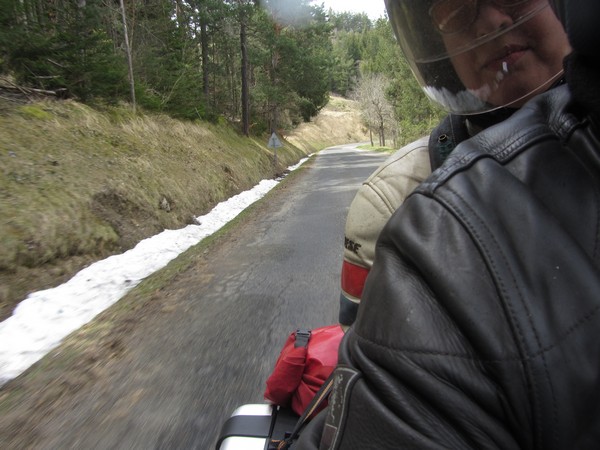Er ligt sneeuw langs de weg, en we zien de hoge, besneeuwde Pyreneeën in de verte. Via Andorra (de stad zelf is een aaneenschakeling van lelijke commercie) rijden we door die besneeuwde hoge bergen.