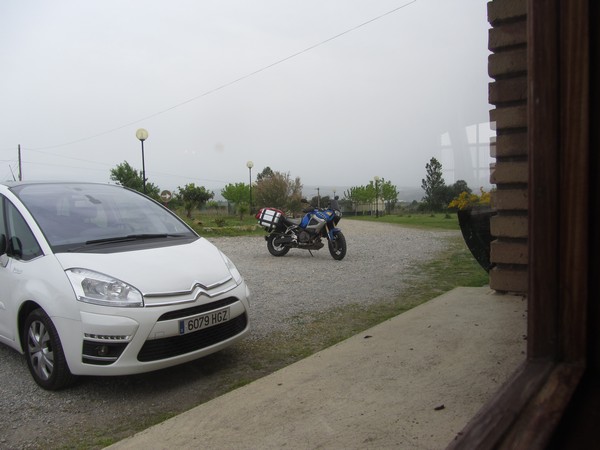Het is hier bewolkt. en af en toe valt er regen. We beslissen om niet terug te rijden en hoog door de Pyreneën te rijden om in Barcelona te komen, maar naar het zuiden af te slaan, rechtsaf, en langs de voeten van de Pyreneën te rijden: hoe lager en hoe zuidelijker, hoe minder kans op regen.