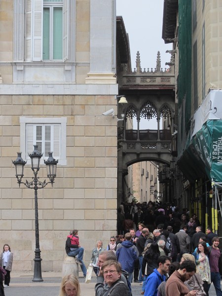 We dwalen, al kletsend, door de Barri Gotic, het centrum van de oude stad van Barcelona. Het is een labyrint van stegen en pleintjes, uit de Middeleeuwen. De gebouwen zelf zijn, zoals de naam van de wijk al zegt, vaak Gotisch, hoewel een onderzoeker in 2011 heeft aangetoond dat dat in veel gevallen helemaal niet zo is: in de 19de en 20ste eeuw zijn veel gevels voorzien van zogenaamd gotische façades, in een poging om het toerisme van Barcelona te stimuleren. Dat is uitstekend gelukt: De Barri Gotic is nog steeds de wijk waar je de meeste toeristen tegenkomt in Barcelona.