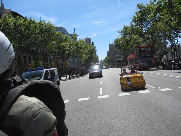 Dan rijden we via de Ramblas. Daar maken we mee dat we door een agent worden aangespoord om door te rijden, als het stoplicht al lang en breed op rood is gesprongen.