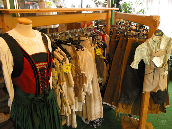 winkels met "Trachten", oftewel klederdracht, en dan verder omhoog, om het centrum heenbuigend.