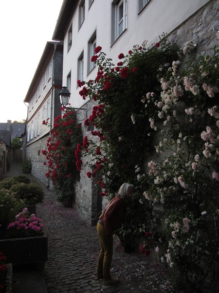 We dalen af langs de helling tegenover die van de Lahn, en komen in stille straatjes terecht, met kinderkopjes en een overdaad aan rozen langs de muren.