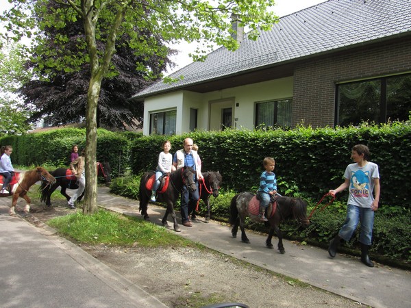 Even verderop kun je dan linksaf de Schönefelderweg inslaan, en daar komen we deze groep overstekende ponies tegen, met kinderen op hun rug.