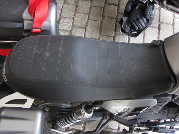 De huiskat blijkt, bij inspectie van het zadel, een Guzzi-fan. Terecht!