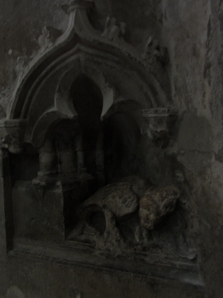 Als je terug loopt naar het zuiden, en omhoog kijkt bij de poort, zie je drie beelden.