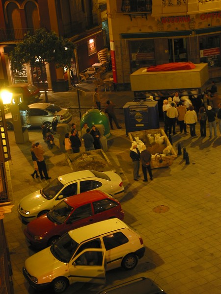Het moet haast wel een oefening zijn voor de Semana Santa, dat ze dan met zo'n "ding" met een Mariabeeld er op lopen of zo. Alle Hermandad's lopen dan met hun eigen Maria op zo'n baar (vol goud, loodzwaar), en het gaat er om wie dat het mooiste doet.