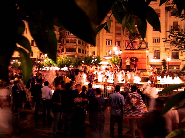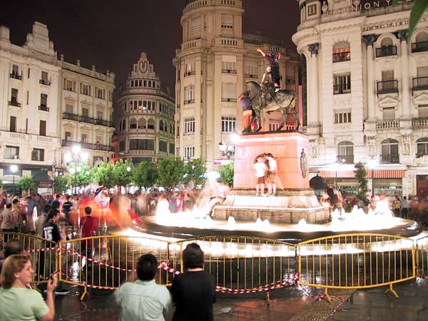 We vragen aan de restauranthouder wat er aan de hand is. Nou, Madrid heeft gewonnen van Valencia. Aha, en dus viert Cordoba feest? maar natuurlijk ;-) Het is prachtig om te zien. Geen enkele vernielzucht, alleen maar blij, en idioot doen. Er fietst iemand door de fontein, en anderen glijden over het randje.