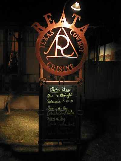 West and North of the Big Bend are ranches: this is a cowboy country. In Alpine , a boy at the gas station pointed us to the Reata restaurant where we could eat cowboy food.