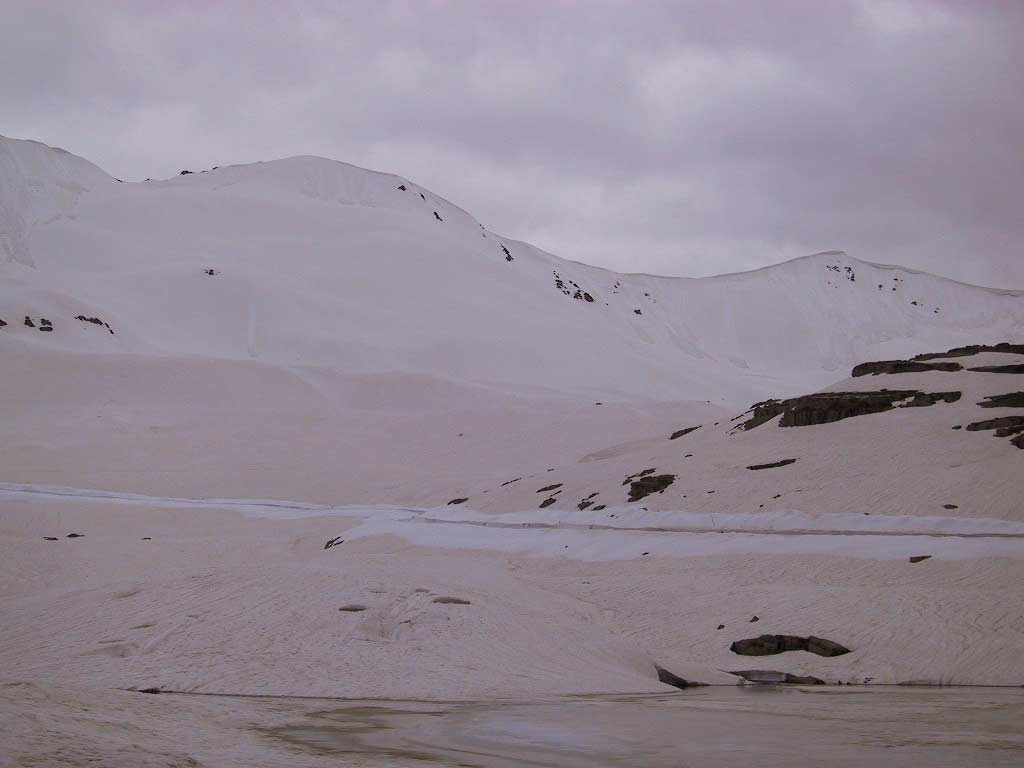 Ik schrijf onze namen in de sneeuwmuur, en wanneer we de bocht om zijn kunnen we er beter overheen kijken. De weg is vanaf die plek echt helemaal ondergesneeuwd, geen denken aan hoe we daar doorheen kunnen komen. Het vreemde is dat we de besneeuwde bergen prachtig kunnen zien, maar niet kunnen uitpuzzelen hoe de weg daar doorheen kan lopen. De weg moet er ook bijna wel *overheen* lopen, want de pas is meer dan 2800 meter hoog, terwijl de bergen hier in de omgeving allemaal een kleine 3000 meter meten.