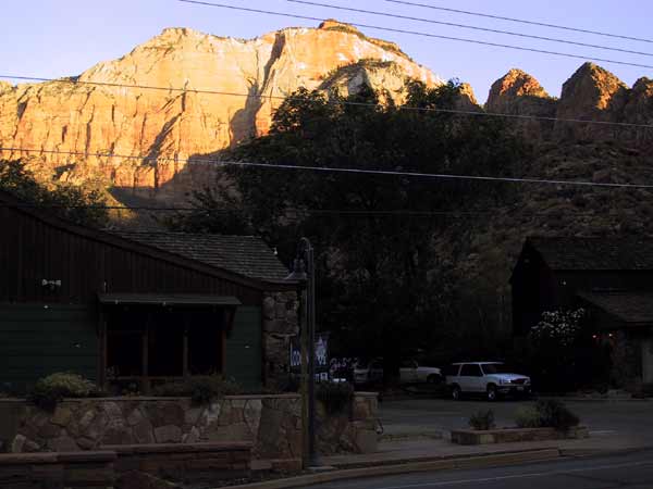 De zon verlicht de rotsen om ons heen ongelofelijk mooi. De weg langs Springdale loopt langs diezelfde Virgin River, door een canyon-achtig geheel dus. Zion is de canyon van de North Fork van die Virgin River, een eindje verderop, en de rest van de rivier gaat daar verder als de East Fork. Gisteren zijn we dus eigenlijk de bergen naast deze canyons ingegaan.