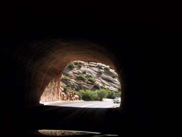 Een tunnel, met eenrichtingsverkeer, want hij is aangelegd vóór de tijd van de campers en dergelijke. We moeten even op onze beurt wachten, maar dat is hier geen enkel probleem.