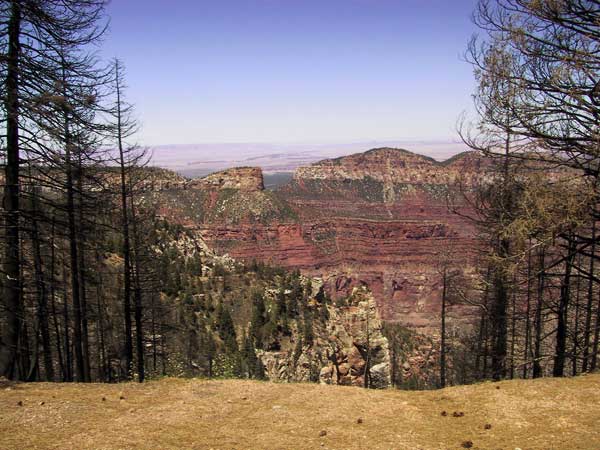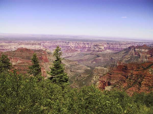 Dan de 389 naar Fredonia, en verder, de 89 East, en dan bij Jacob Lake rechtsaf, naar de North Rim van de Grand Canyon. Die is op z'n diepst bij de South Rim , maar daar is dan ook een hele toeristenkermis: daar moet je in de file om de canyon te kunnen bekijken, en eet je bij McDonalds. De North Rim heeft maar 10% van het aantal bezoekers van de South Rim.