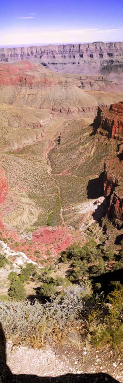 Naar links kun je de diepte in kijken. Het lijkt zo'n lullig stroompje, die Colorado, maar dat is het dus niet, het is gewoon verschrikkelijk diep. Als je goed kijkt zie je hier wat "mos" langs de kanten. Dat zijn dus bomen...
