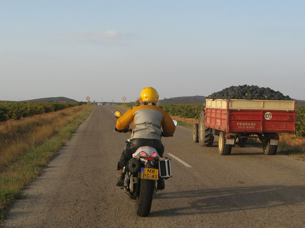 Hier en daar rijdt een trekker met kar, volgeladen met druiven (en bij zo'n op-en-neerweg kan zo'n trekker helemaal aan het zicht onttrokken zijn, verstopt in een dal).