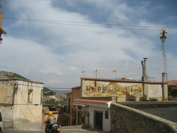 Alpuente heet ons welkom met een enorm tegeltableau: Bienvenidos a Alpuente.