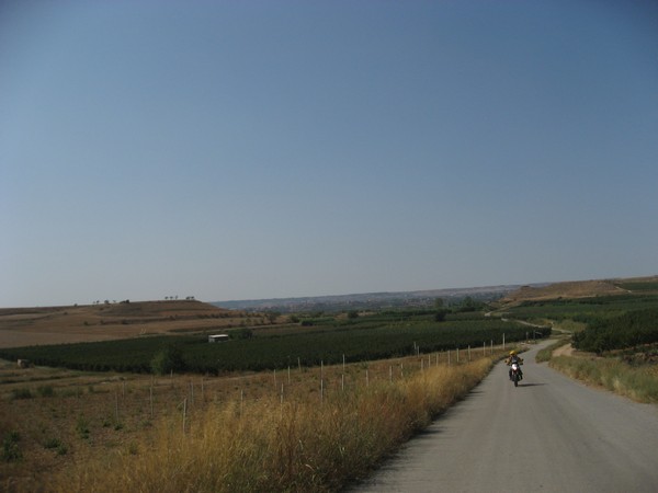 We rijden lange tijd met links de moerassige oevers van de Segre en rechts rotsige bergen, en dan komen we in een gebied met fruitbomen en wijngaarden.