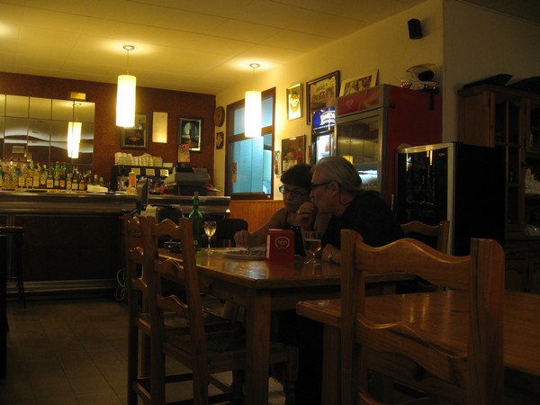 Er zijn mensen aan het poolen en er zijn mensen aan het darten, en wij eten tapas, en zitten daar heerlijk te wennen aan Spanje: tv aan, muziek aan, iedereen houdt van kletsen, overal tegels zodat de geluiden lekker klinken.