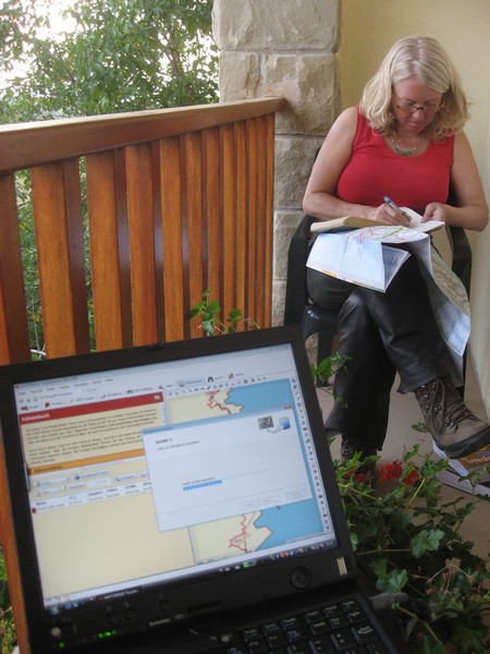 We hebben de bagage naar beneden gesjouwd en bij de motoren neergezet, en zitten zelf in het hotel te ontbijten, met de motoren in het zicht.